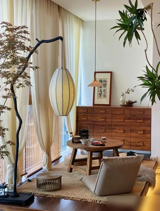 要是户型小,阳台或飘窗是黄金点位——铺块草席,小圆桌一架,席地而坐看街景,悠闲得像度假。