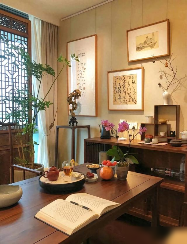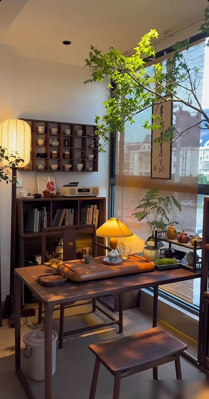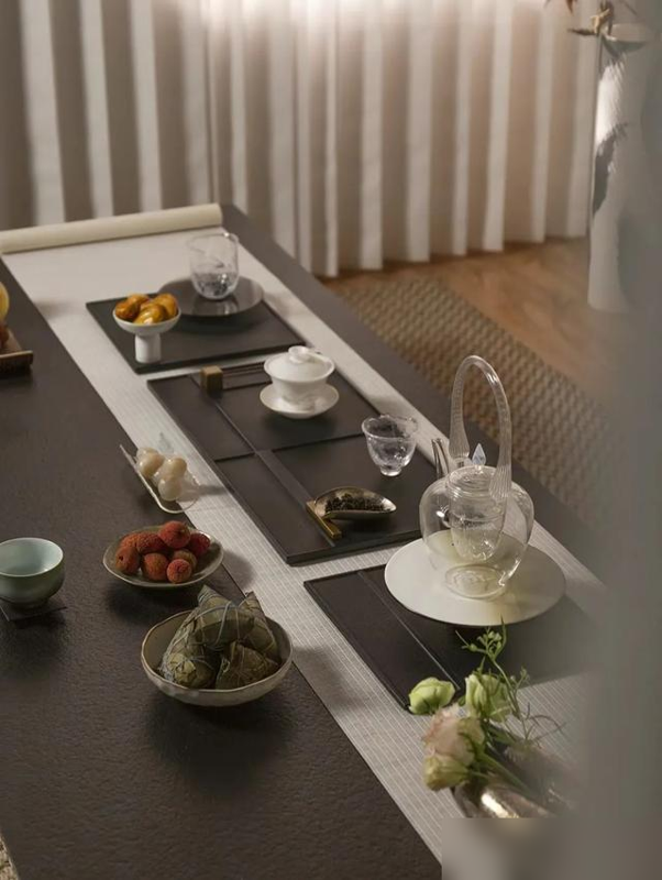 空间大点儿的,可以搞个独立间,铺上胡桃木长桌,配几张素雅椅子,墙上挂幅水墨,角落摆盆文竹,古风古韵就出来了;要是家里现代范儿足,一张长方形茶席加几件精巧茶具就搞定,随手一摆都透着随意自在。